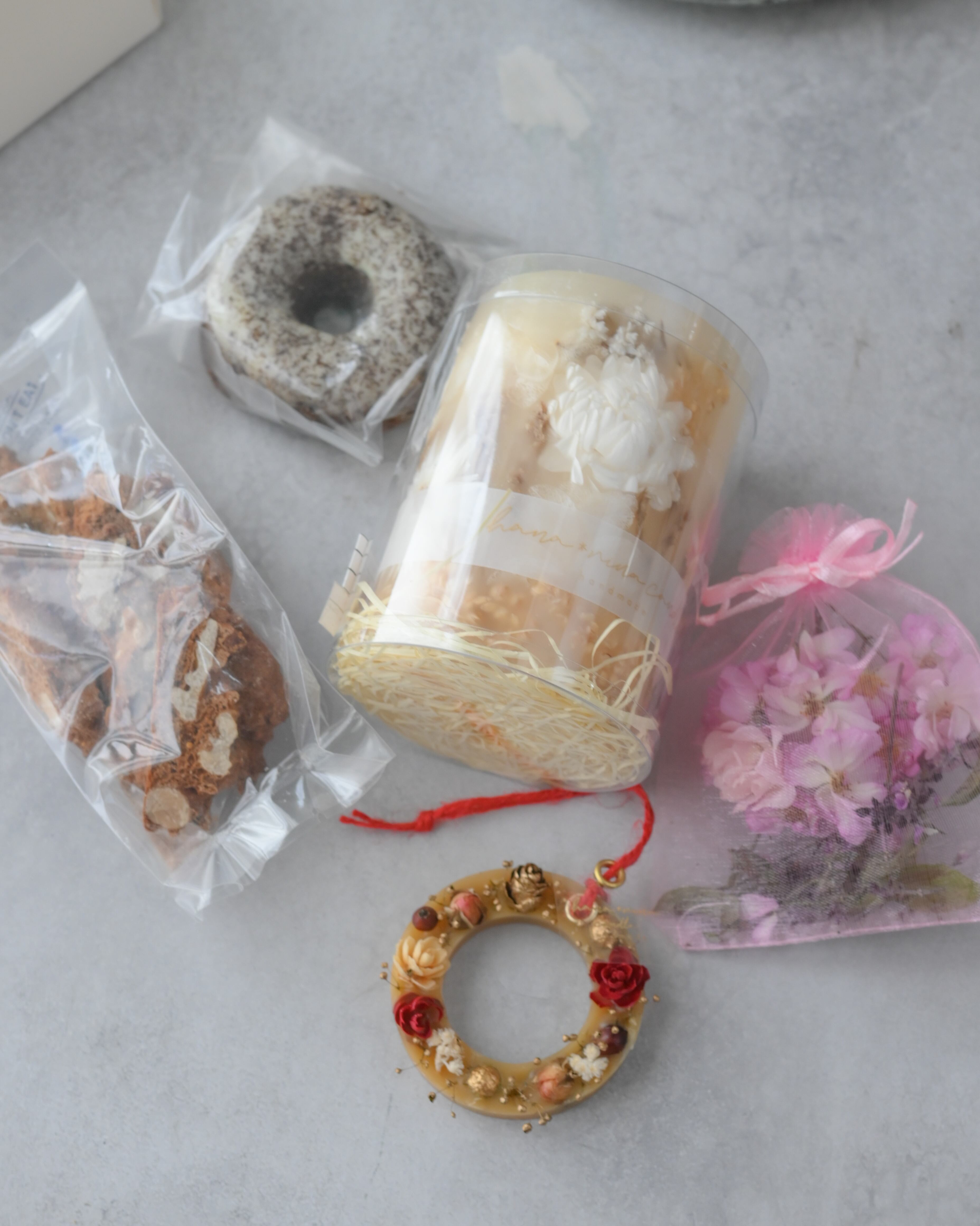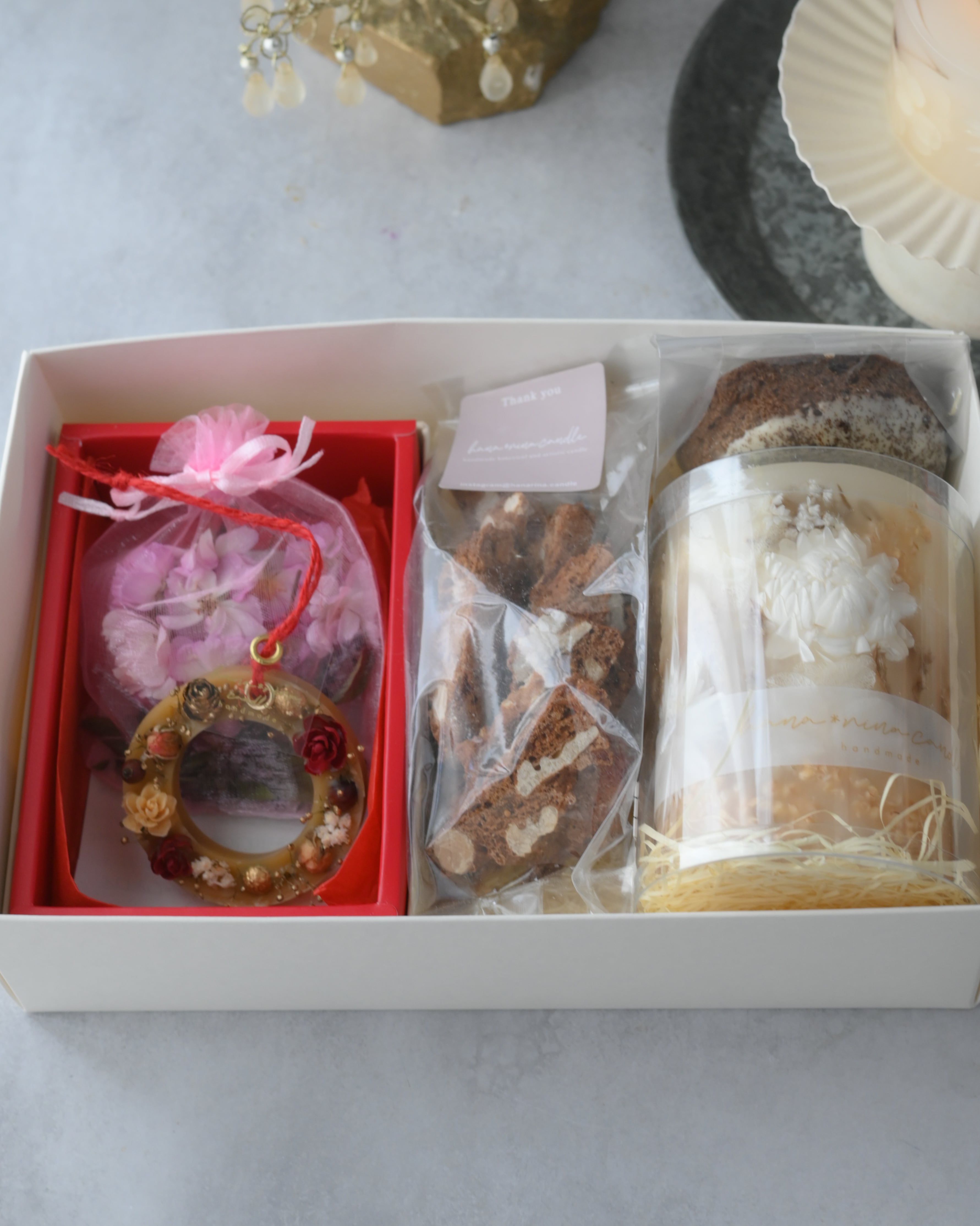 白いヘリクリサム、紫陽花、タタリカ、スパニッシュモスなど、白いお花だけを使って作ったホワイトガーデンというボタニカルキャンドルと、サシェ、焼菓子のギフトセット。