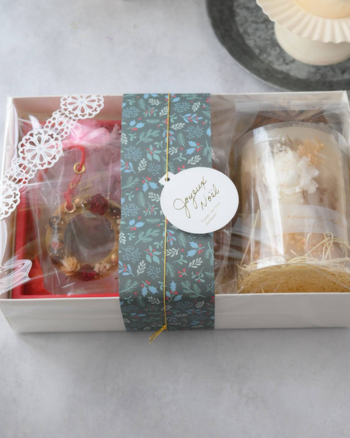 キャンドル、クリスマスのオーナメントにも出来るサシェをセットにしました。