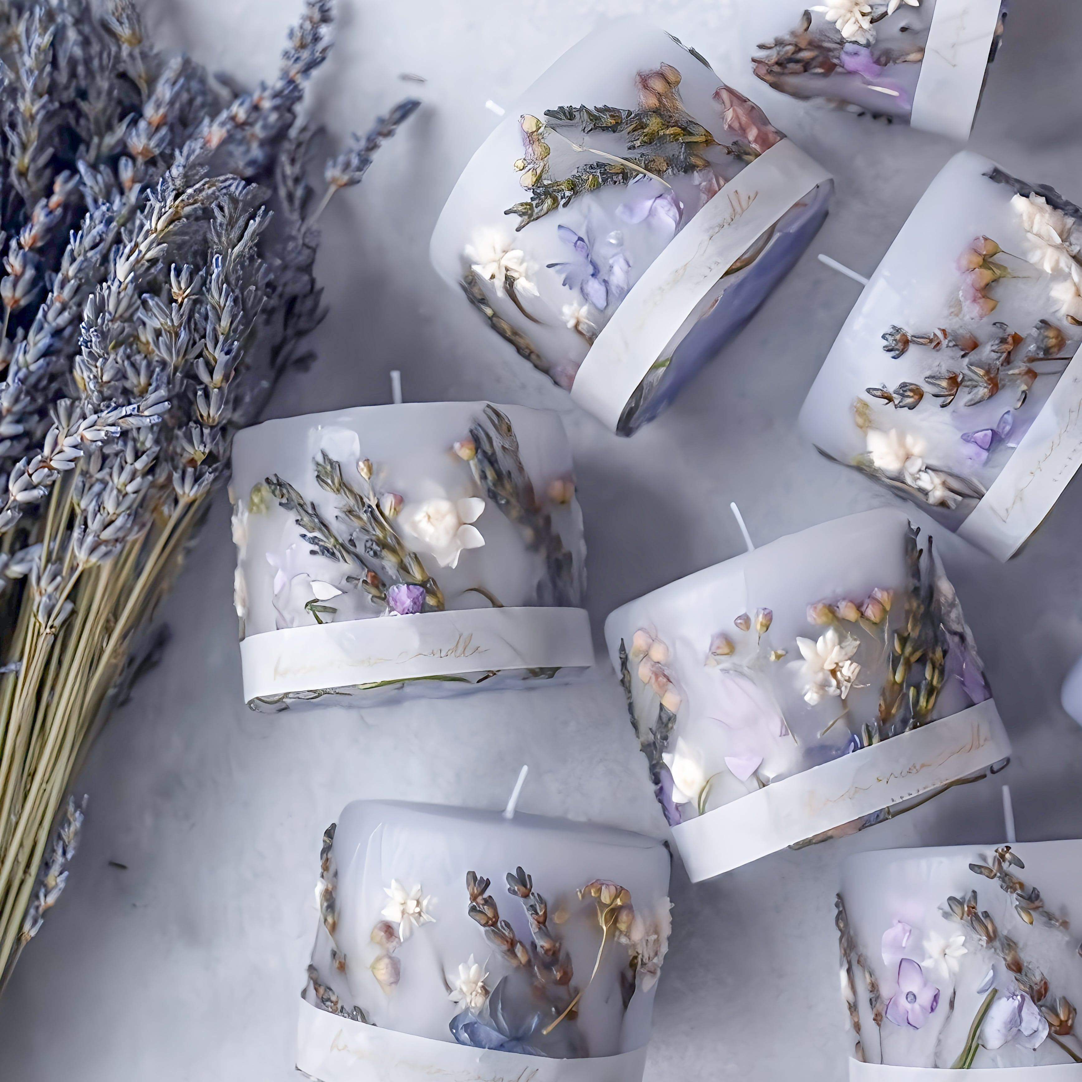 香り高く香水の原料とされるラベンダーグロッソを無農薬で育てて咲いたものをドライにして時間をかけ蝋に浸潤させて、最後にラベンダーの精油を垂らして作りました。