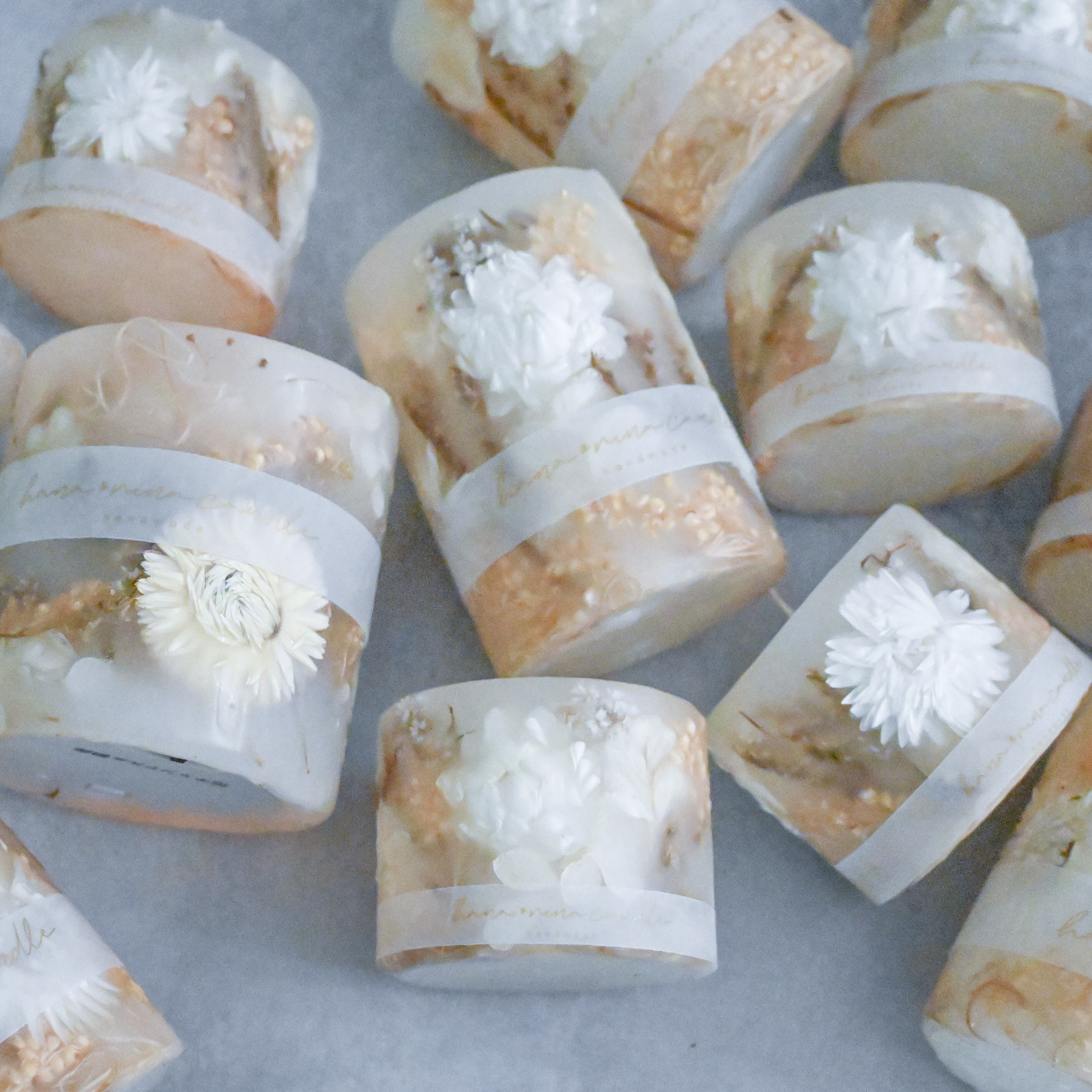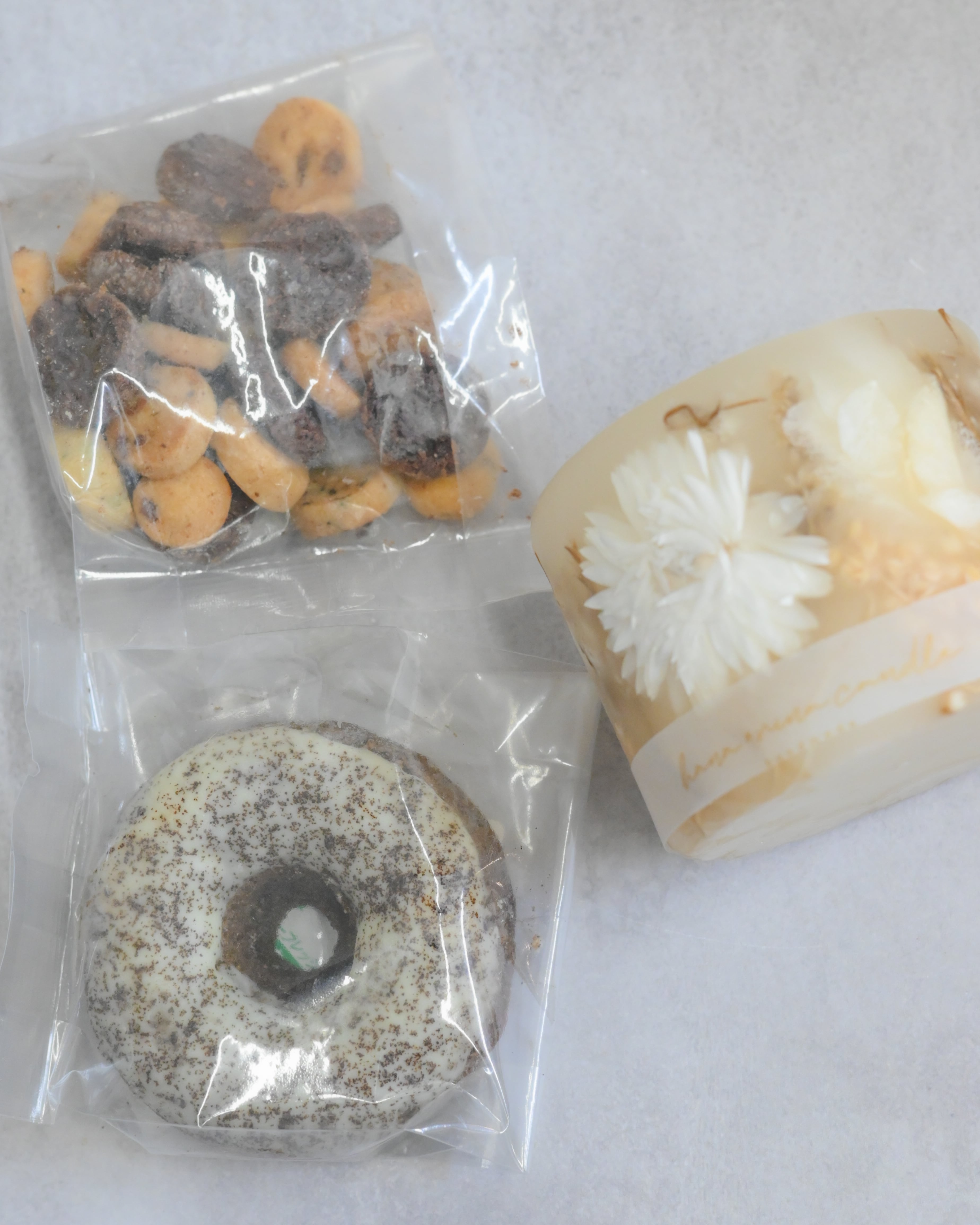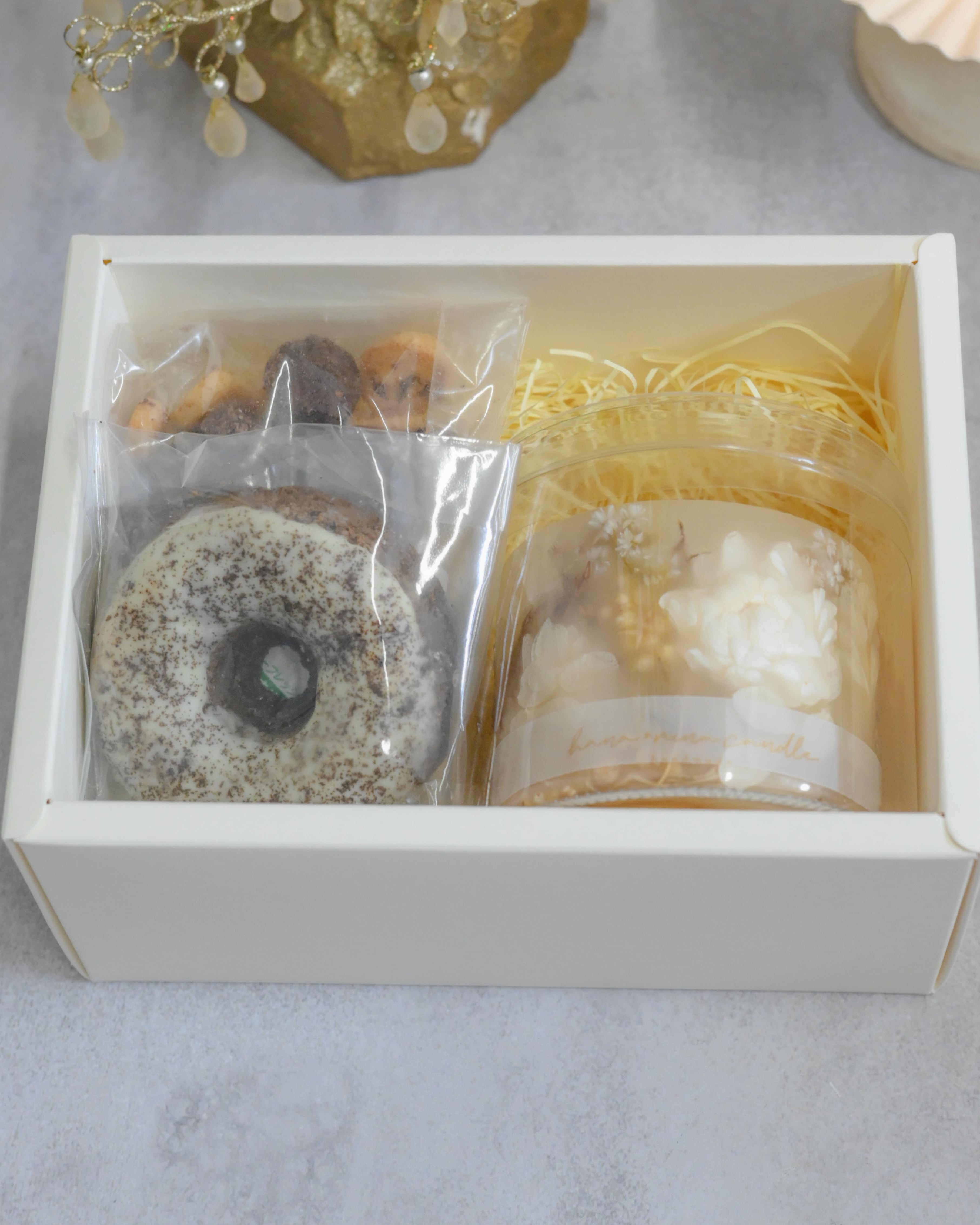 白いヘリクリサム、紫陽花、タタリカ、スパニッシュモスなど、白いお花だけを使って作ったホワイトガーデンというボタニカルキャンドルと、焼菓子のギフトセット。