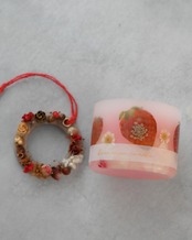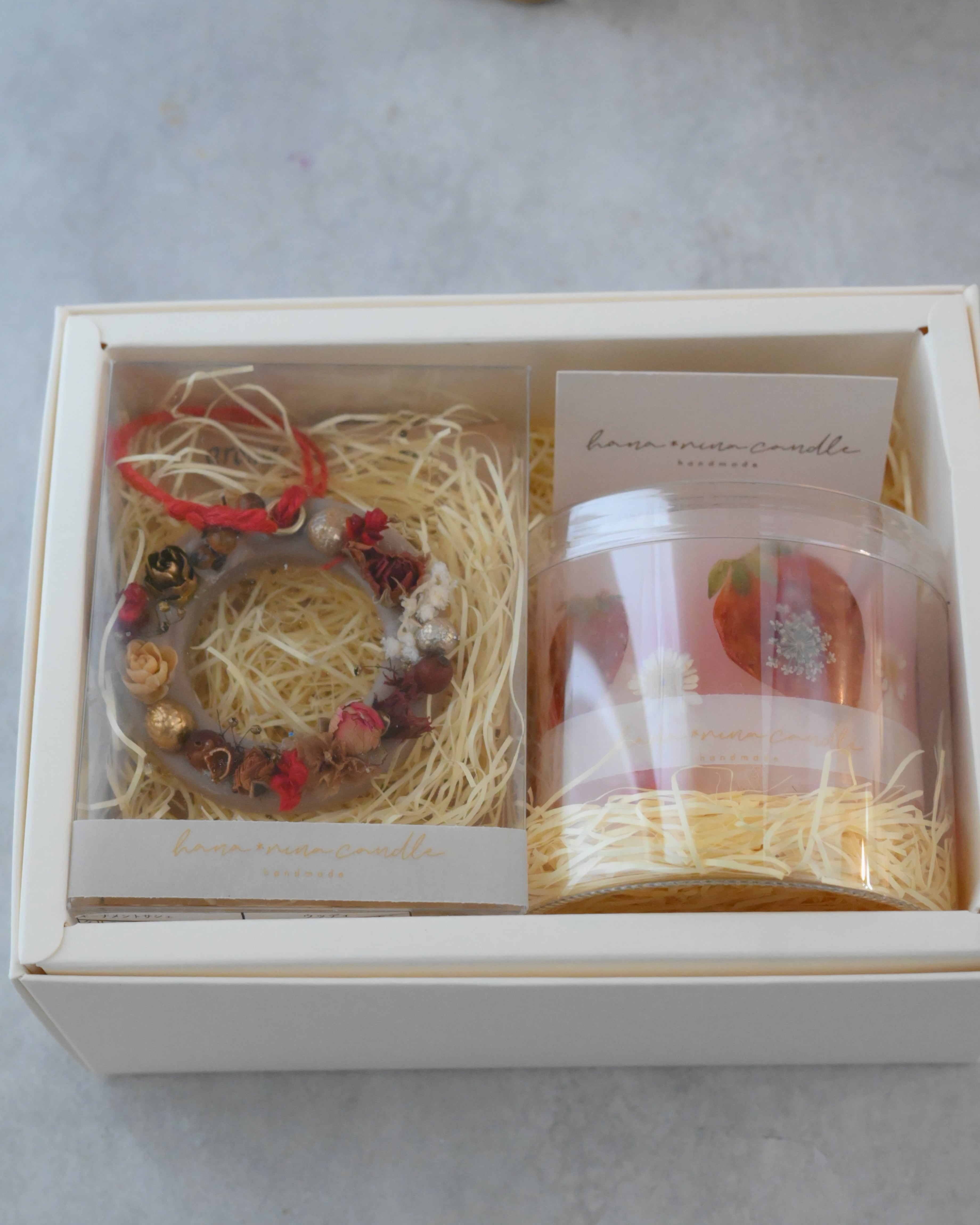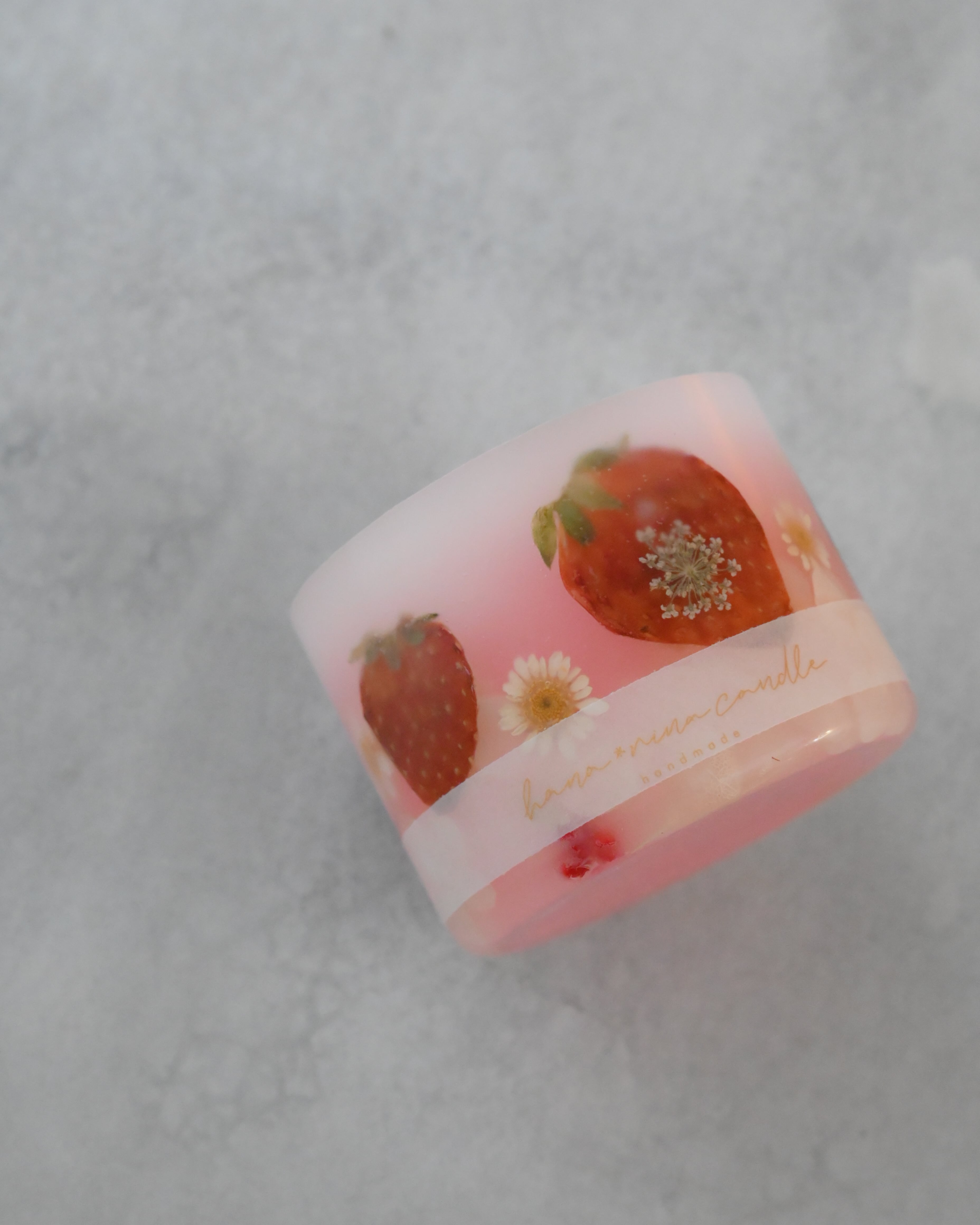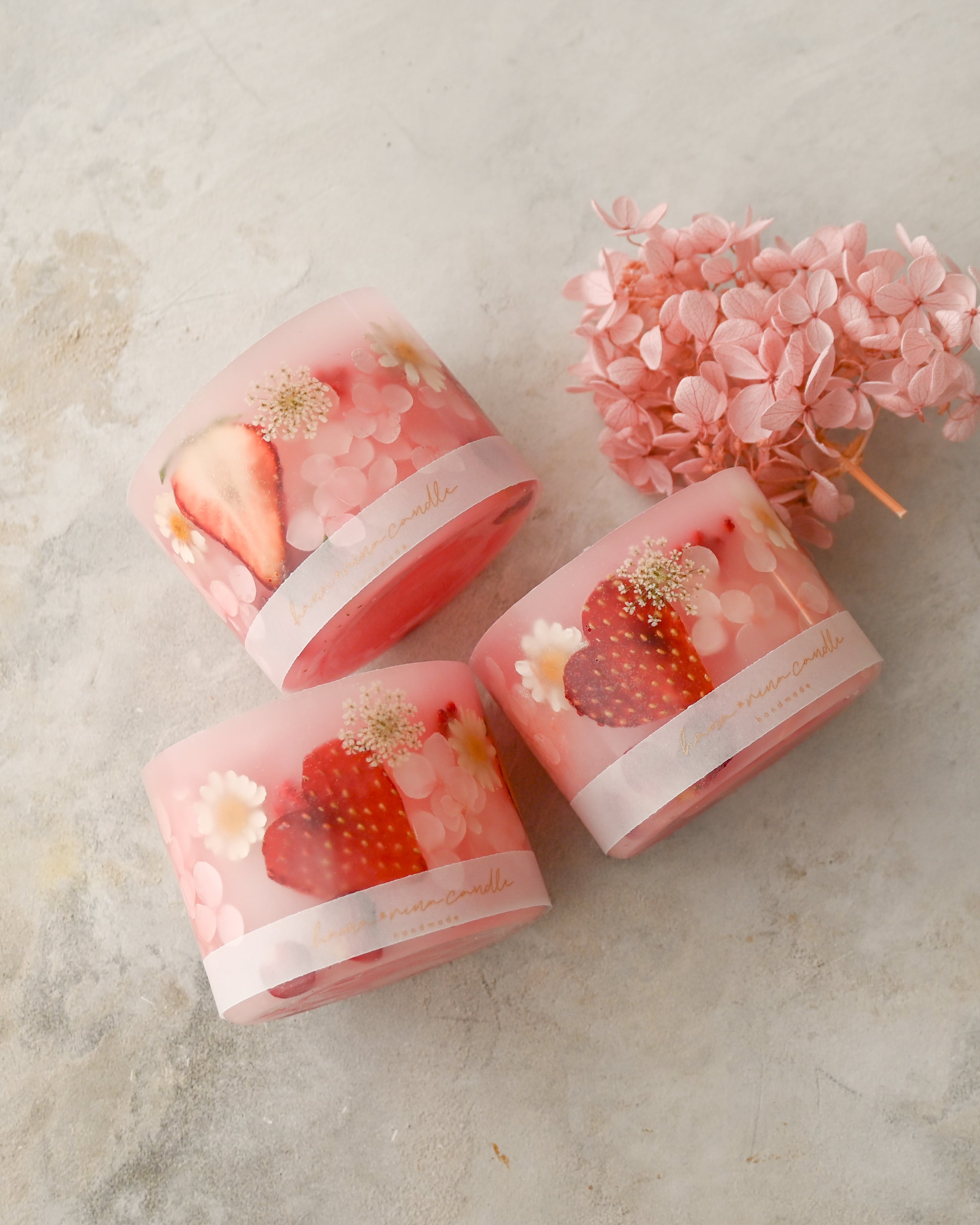 一つ一つイチゴを押した押しイチゴを入れて作ったイチゴのキャンドルとオーナメントにも出来るリースサシェのギフトセット