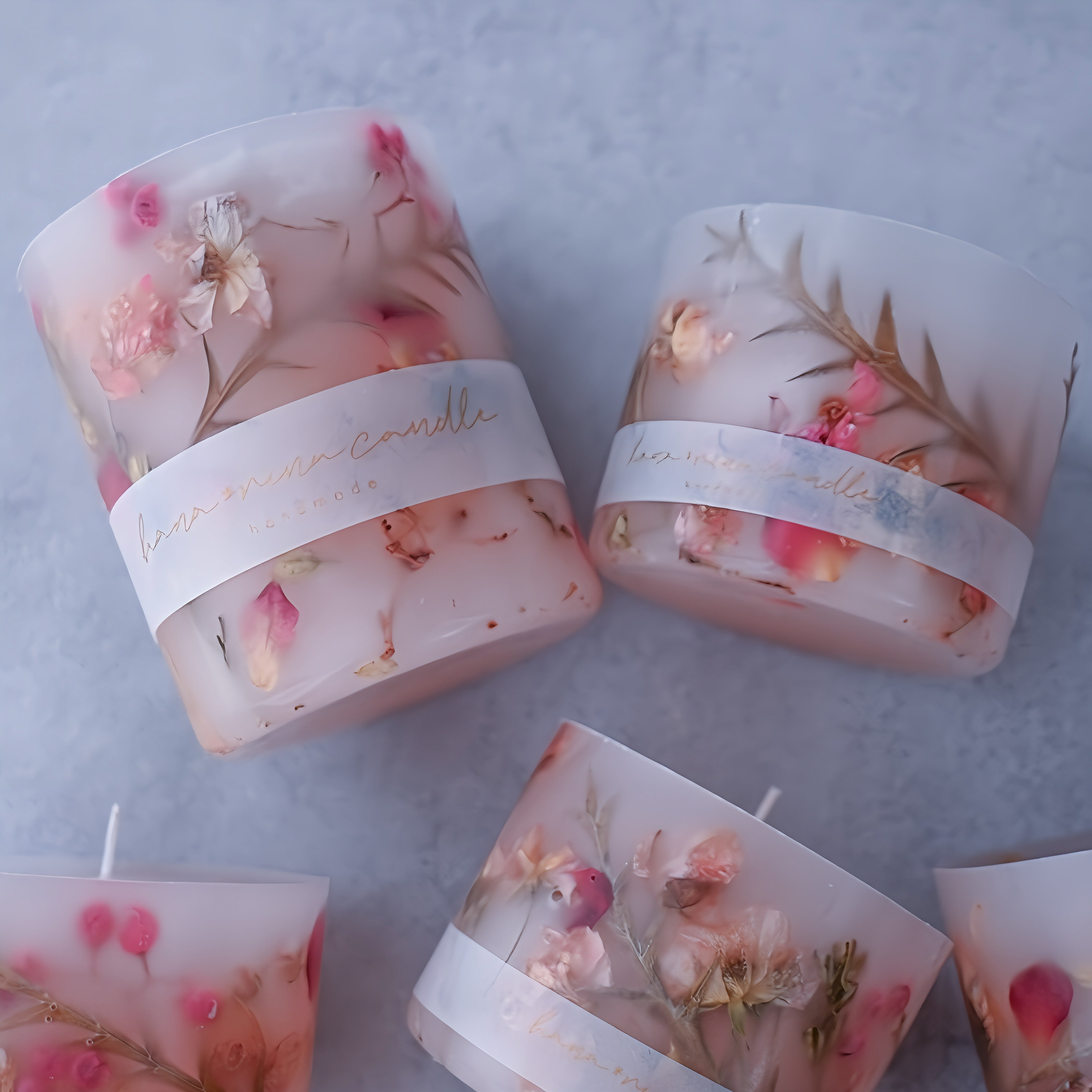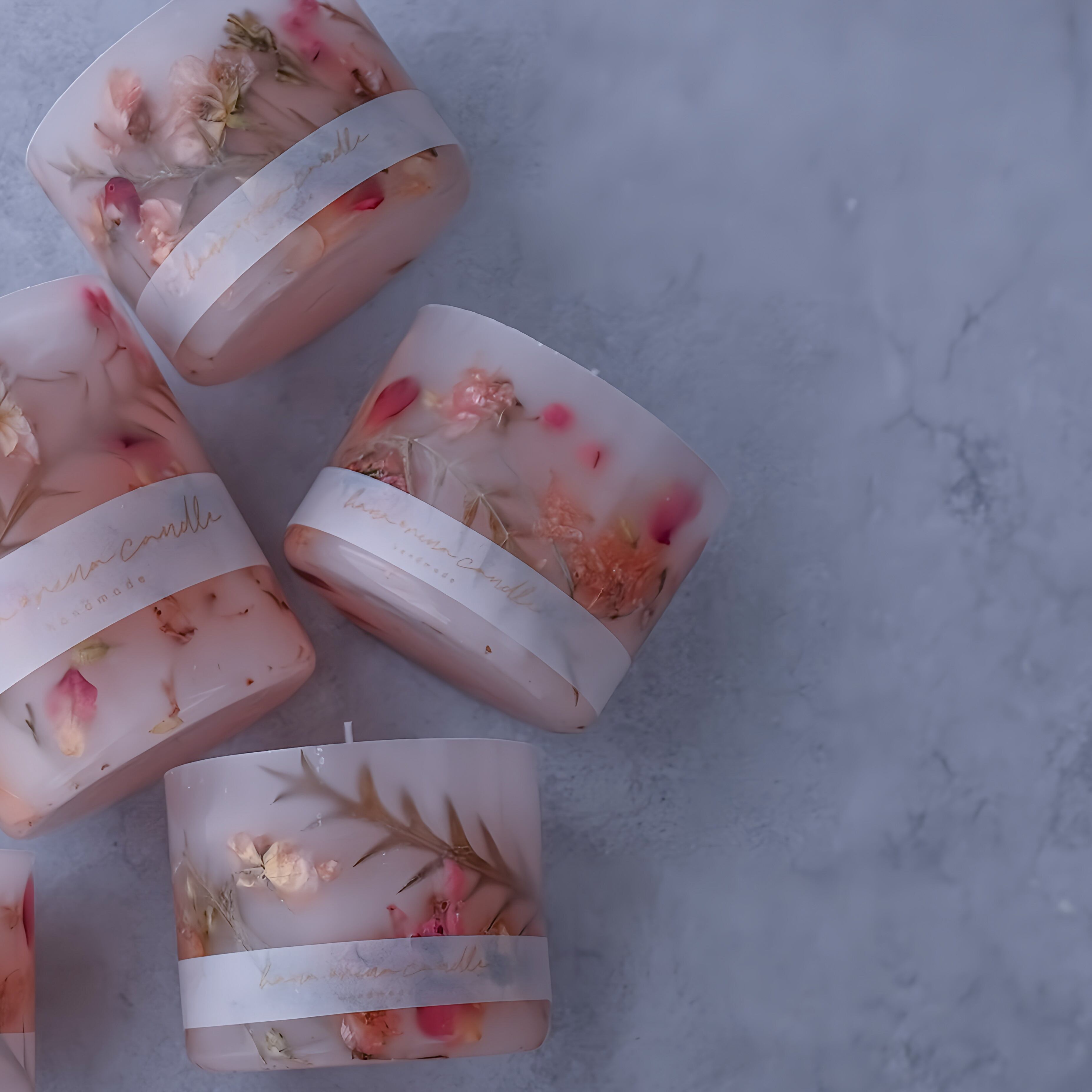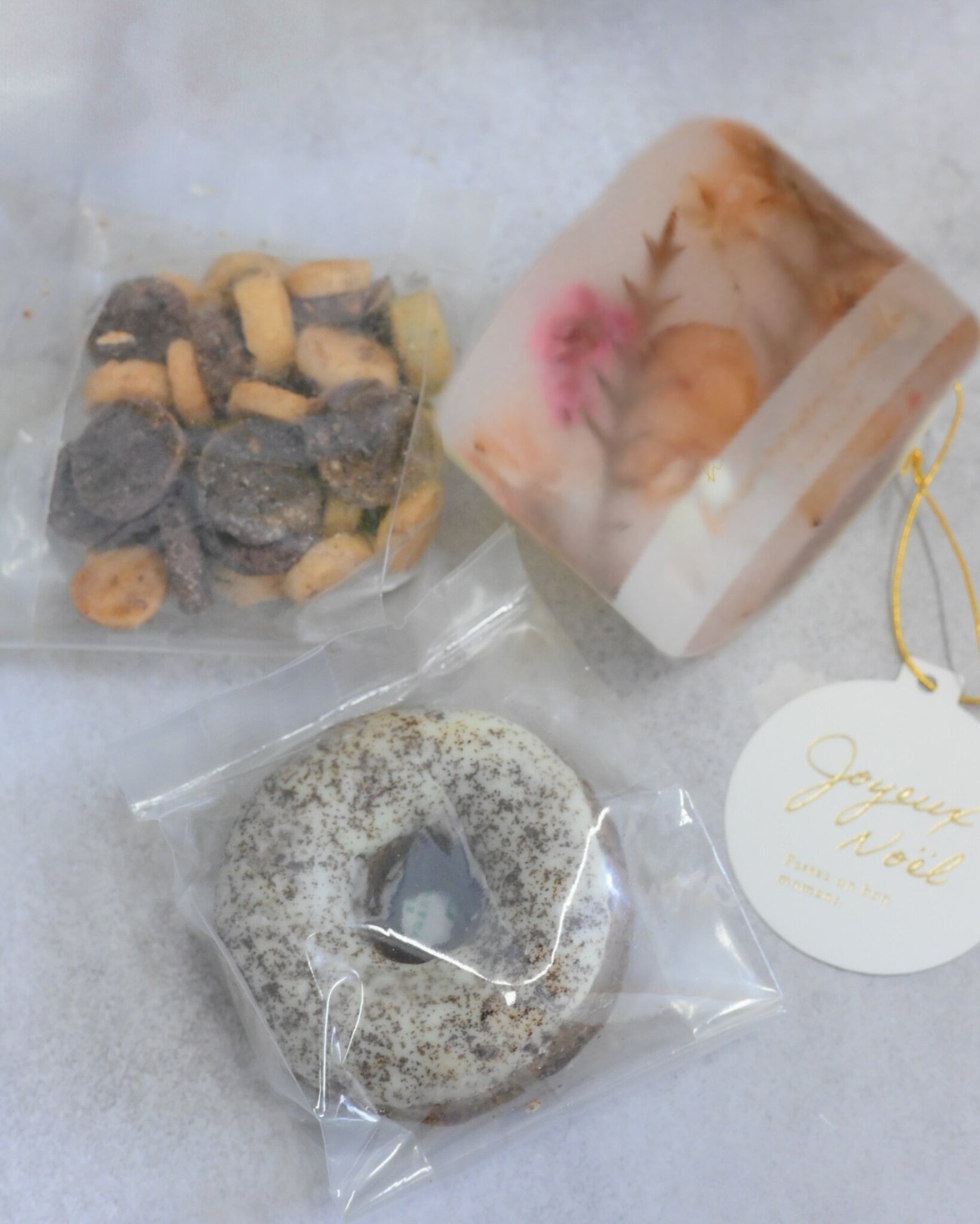 アンティーク色になったポールズヒマラヤンムスクに、秋色ミナヅキ、ピンクのデルフィニウム、グレビレアアイバンホー、ペッパーベリーなどを入れたボタニカルキャンドルと、焼菓子のギフトセット。