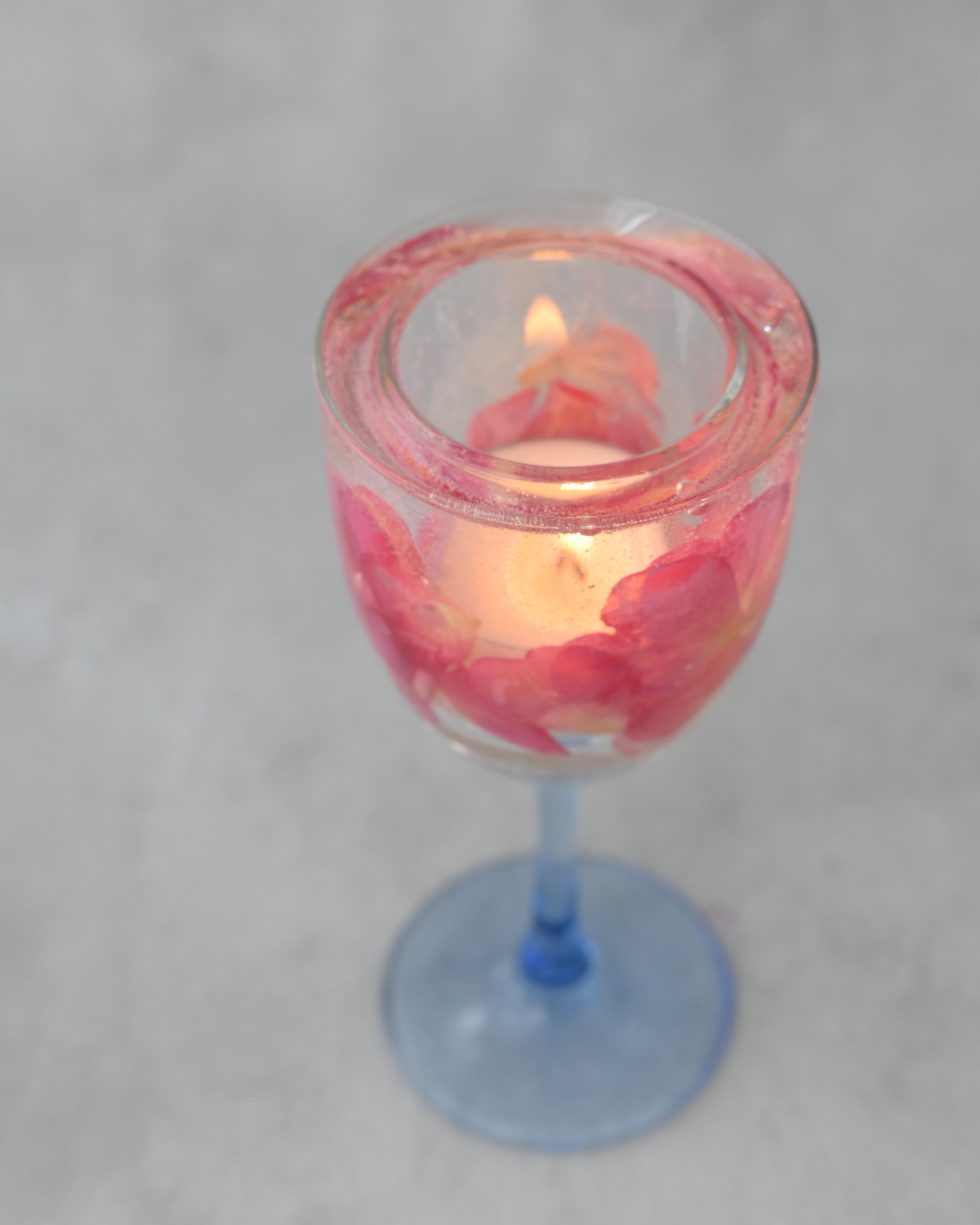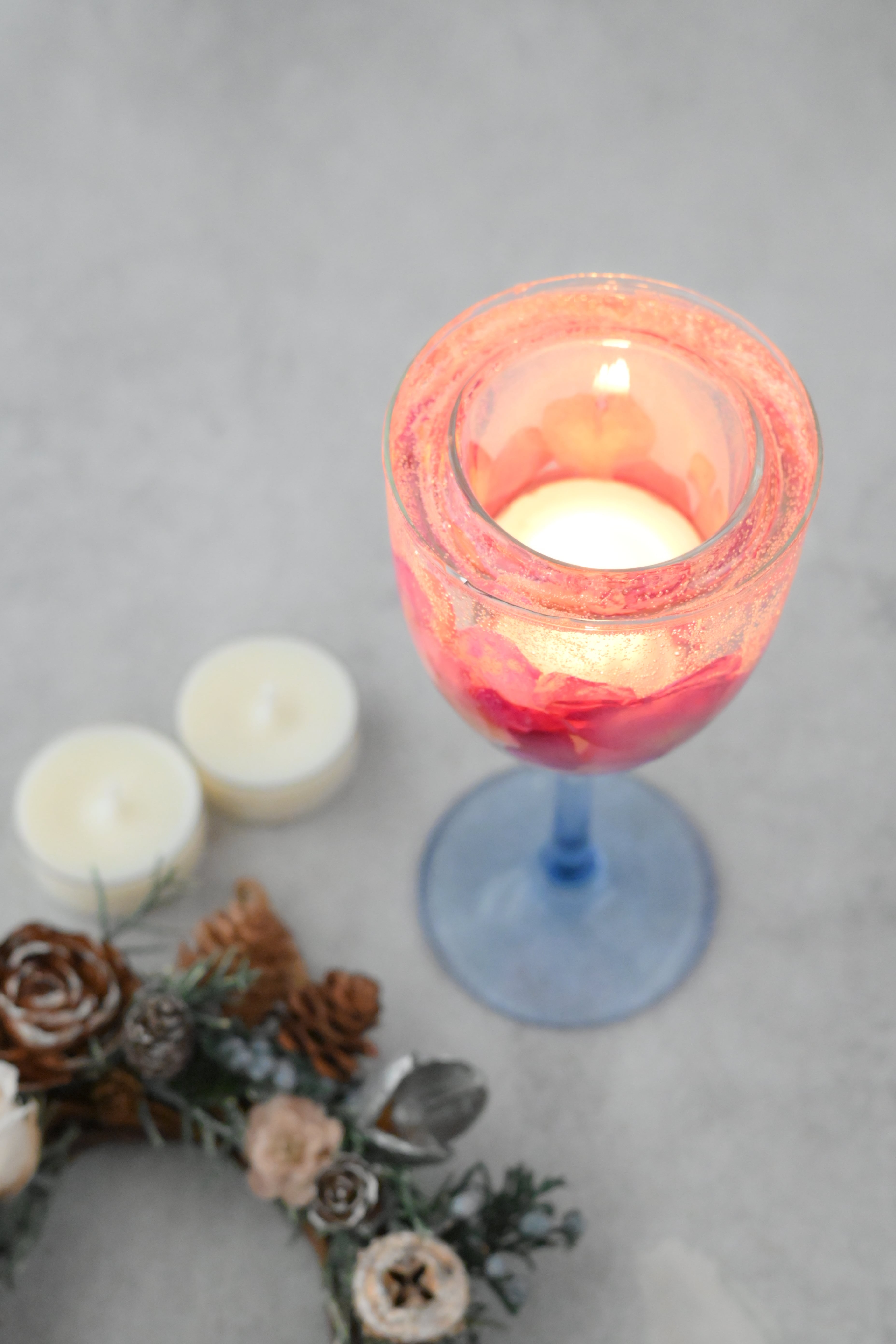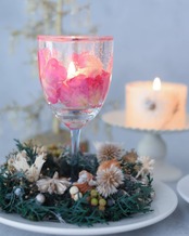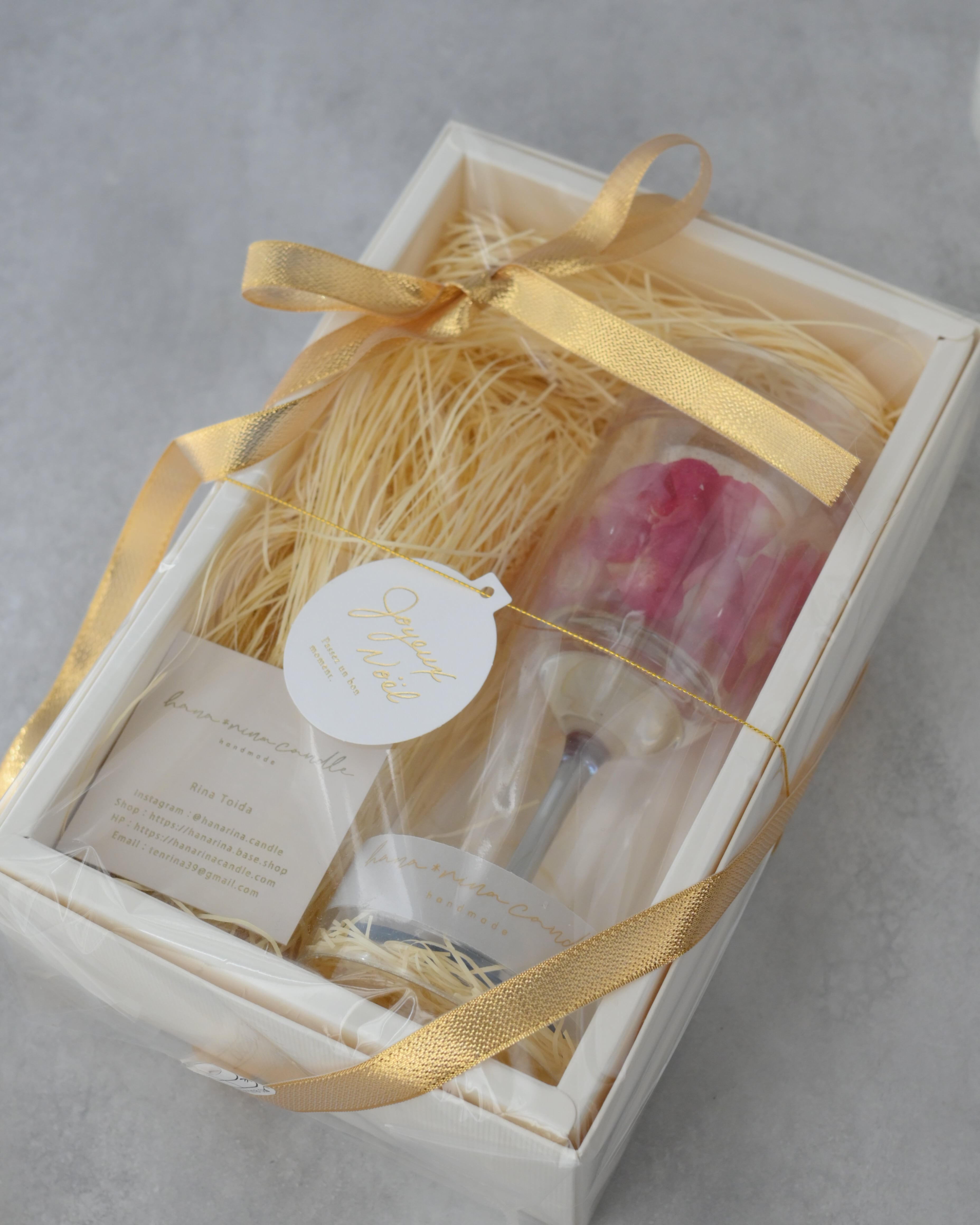 ワイングラスに薔薇の花びらを閉じ込めたグラスキャンドルと、焼菓子のギフトセット。