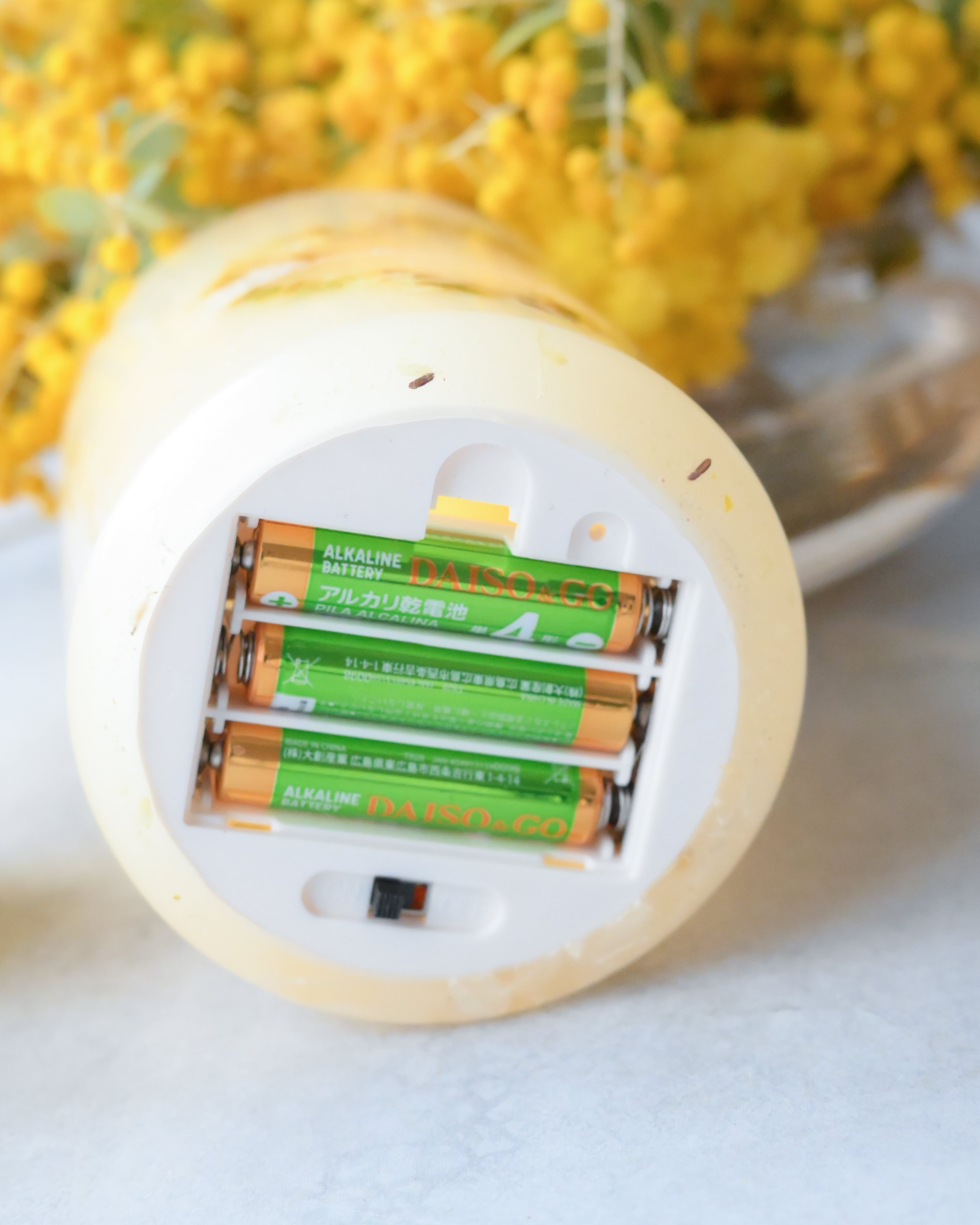 庭で咲いたミモザのパールアカシアと、黄色いお花で作った花冠を入れたナチュラルなデザインのLEDランタン。